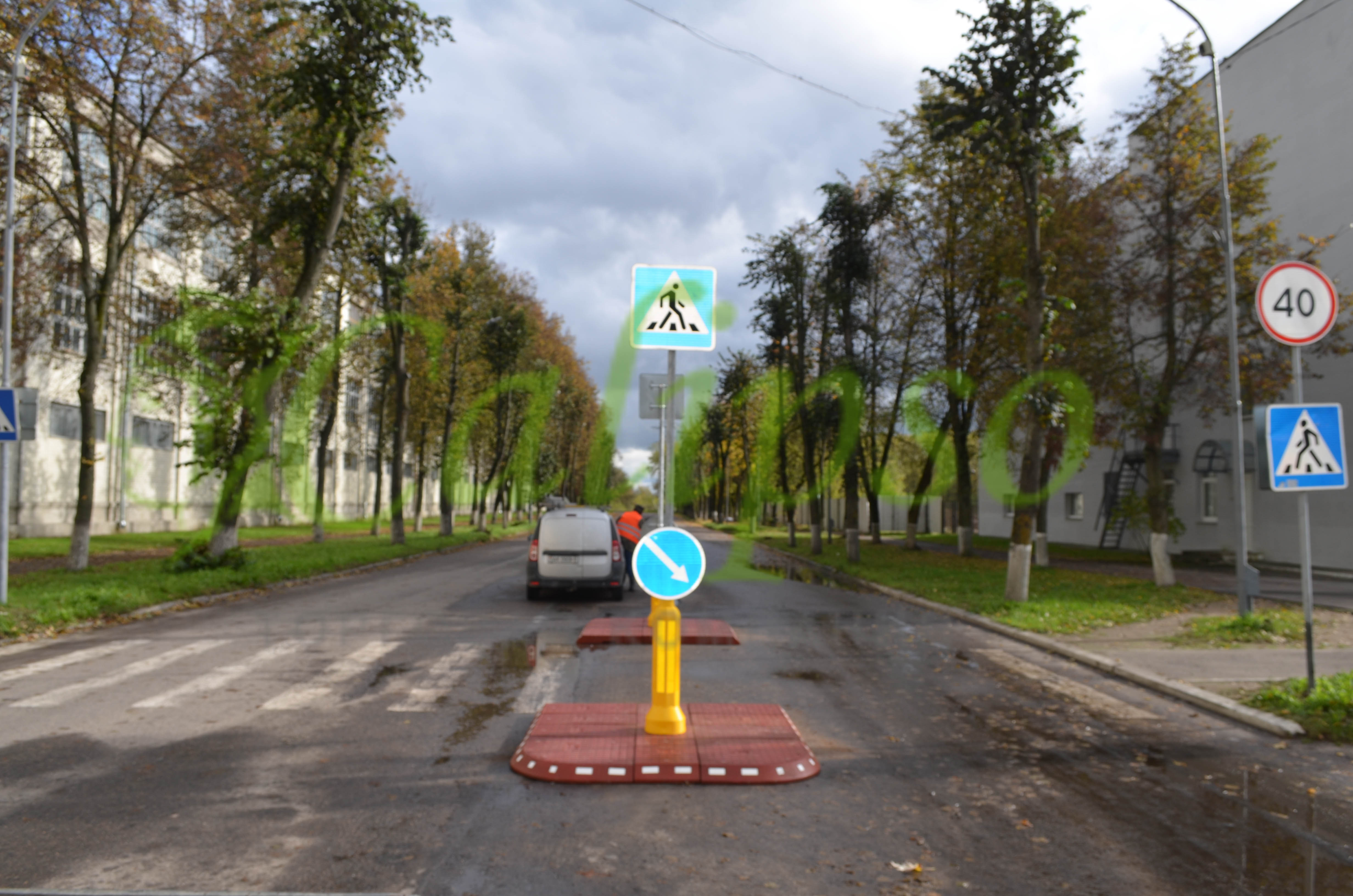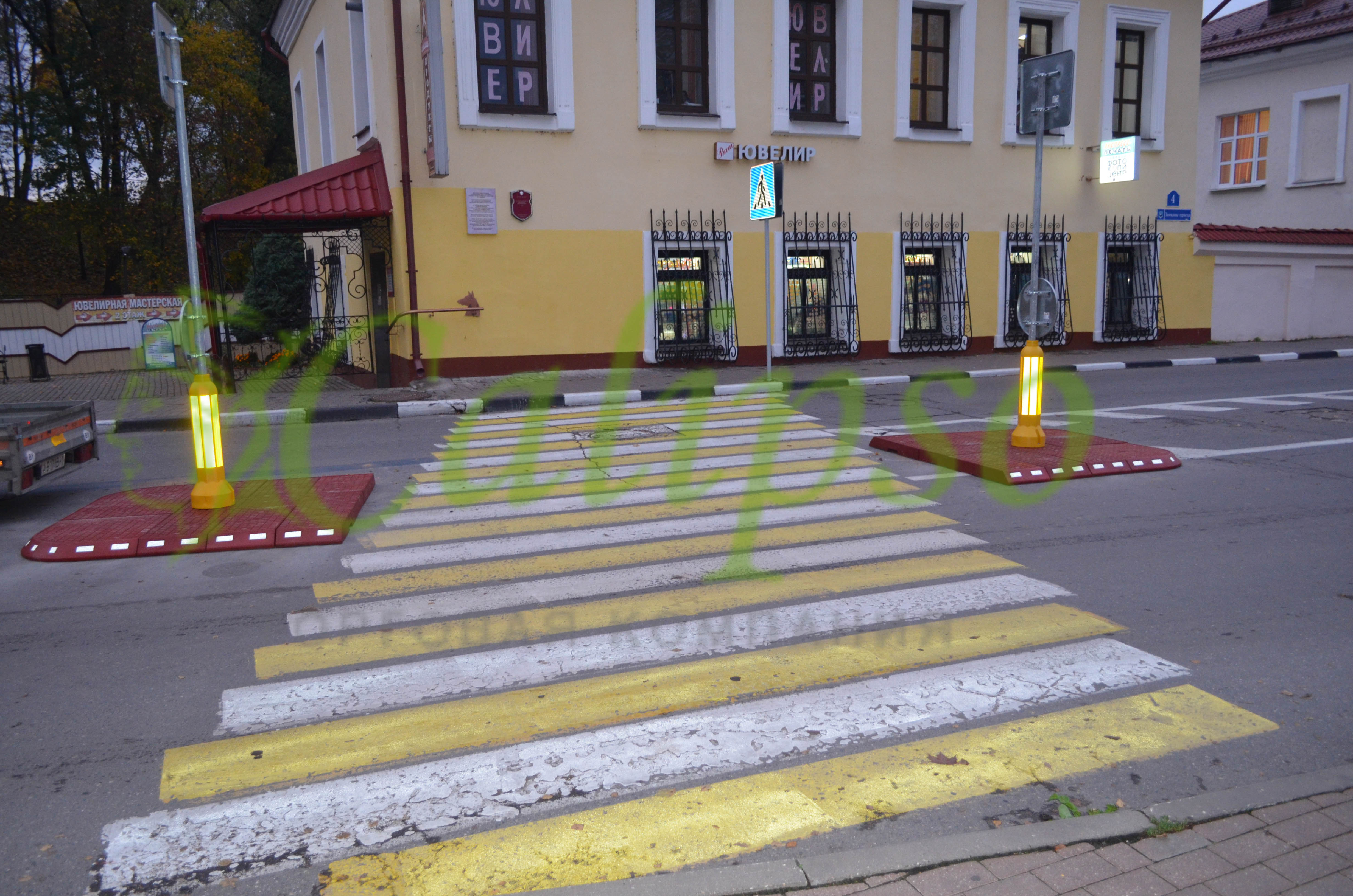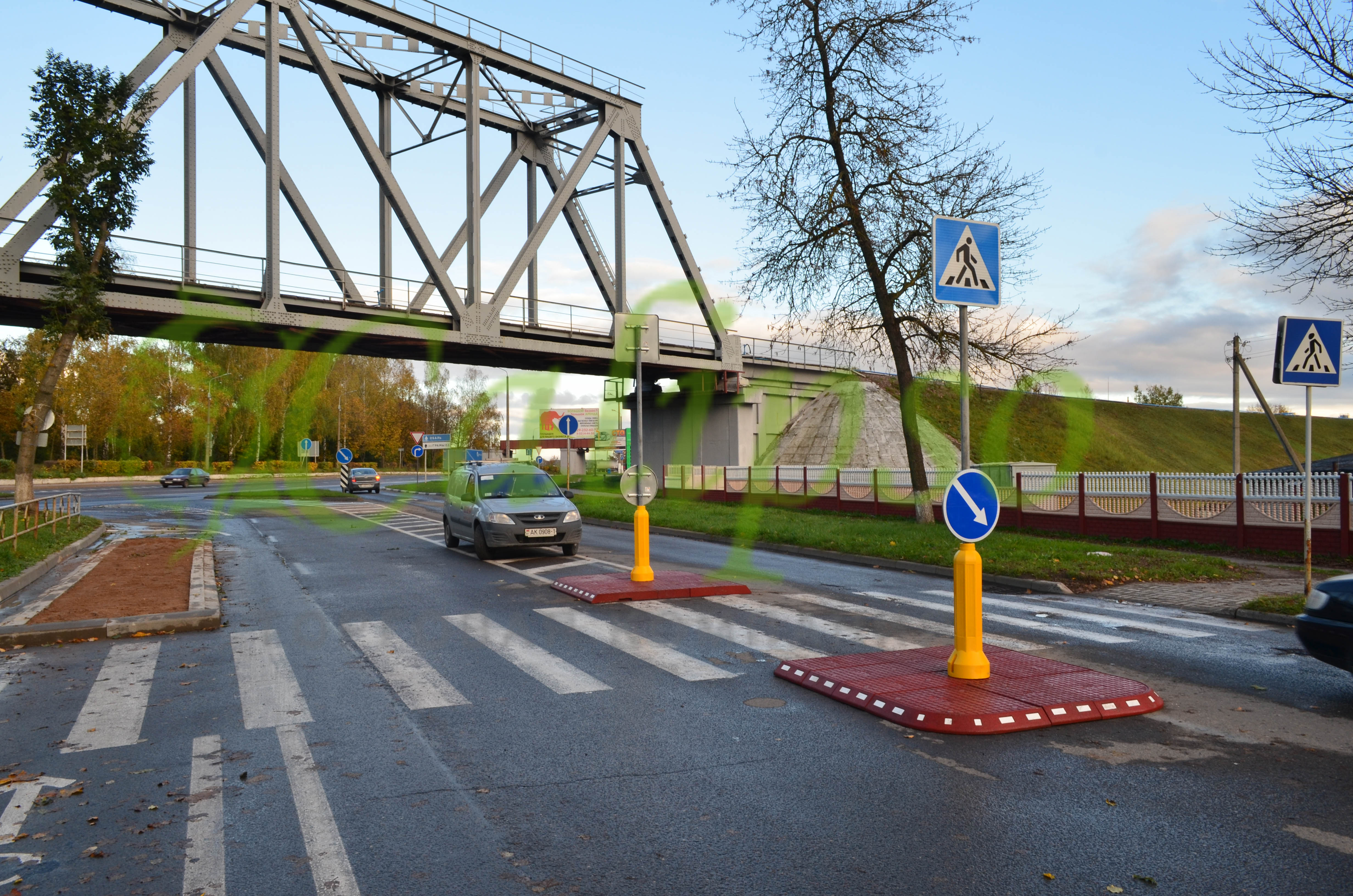 Искусственные островки монтируются на полосе, разделяющей потоки движения автотранспорта, на пешеходном переходе. Элементы островка изготовлены из резины, устойчивы к механическим повреждениям. Яркая окраска и светоотражающие полосы привлекают внимание водителей, даже в темное время суток, повышая при этом безопасность пешеходов.