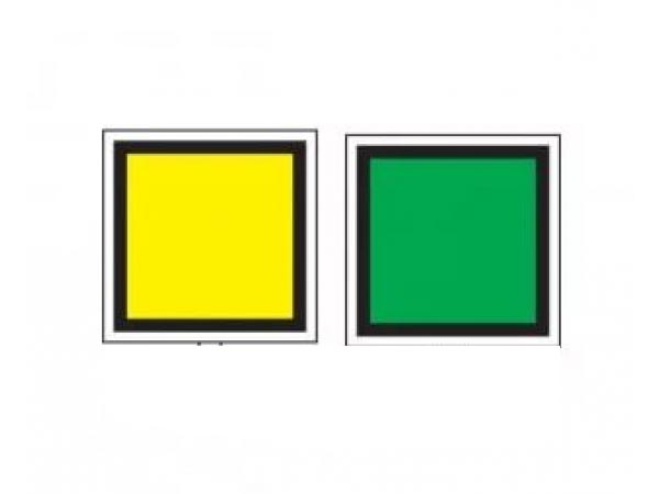 Желтый знак на перегоне и на главном пути станции сигнализирует о движении с уменьшением скорости. На остальных путях станции разрешает движение со скоростью, указанной в предупреждении или не более 25 км/ч. Зеленый знак разрешает повысить скорость до установленной после прохождения опасного места всем составом.